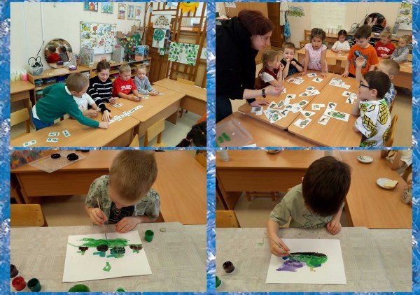 На занятии по аппликации дети изготовили кудрявые деревья из разноцветных колечек. А в своих рисунках с удовольствием передали природные пейзажи, изобразив разные виды осенних деревьев, используя техники примакивания и тычка щетинной кистью. В лепке у ребят получился настоящий листопад из ярких осенних листьев.