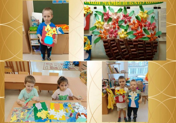 Самым главным событием этой недели стал праздничный концерт, посвящённый 8 марта. Вместе с лягушкой Машей ребята разыграли для мам и бабушек целое представление, порадовали их стихами и песнями и даже сыграли на ложках. Нашу раздевалку мы украсили праздничной газетой, на которой дети изобразили корзинку с лилиями. В подарок своим любимым мамам дети смастерили белые и жёлтые нарциссы, а для бабушек нарисовали в вазах яркие весенние цветы.