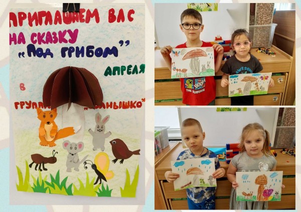 На неделе с 16 по 20 марта в нашей группе начался проект «Играем в театр». В ходе проекта ребята совершили виртуальную экскурсию в театр. Дети увидели, что в театре есть гардероб, театральное фойе, зрительный зал, сцена, оркестровая яма; познакомились с театральными профессиями: актёр, режиссёр, художник – декоратор, костюмер, гримёр, звукооператор и разными видами театра – балет, драматический театр, оперный театр, кукольный театр. Совсем скоро наши ребята превратятся в настоящих артистов и покажут спектакль по сказке В. Сутеева «Под грибом», а пока дети с удовольствием готовятся к этому событию – разучивают роли, изготавливают афишу и билеты. Появился в нашей группе и театр по сказке, изготовленный руками наших ребят в который они с радостью играют. В течении этой недели ребята смастерили сказочных персонажей из пластилина, в рисунках отразили один из эпизодов сказки, а также вырезали и наклеили героев сказки на занятии по аппликации. Из детских работ мы собрали книжку и теперь у нас в группе есть сказка «Под грибом», иллюстрированная нашими ребятами.
