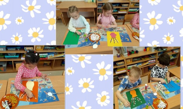 В группе, ребята трудились над подвесами в виде осенних деревьев. Совместно создавали коллективную работу на осеннюю тематику.