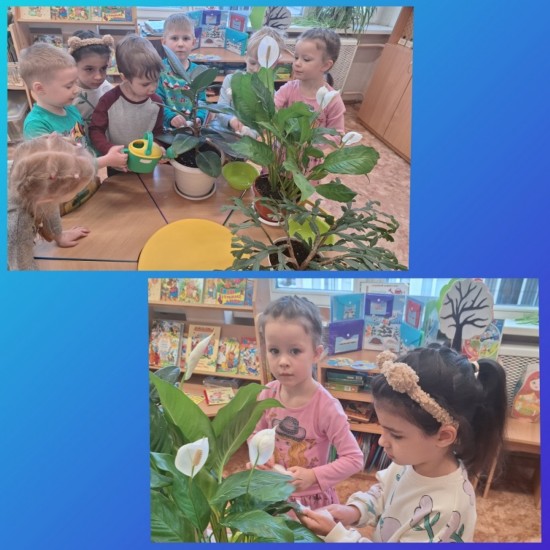 В нашей группе на окне, Во зелёной во стране, В расписных горшочках Подросли цветочки. Вот розан, герань, толстянка, Колких кактусов семья. Их польём мы спозаранку. Я и все мои друзья.