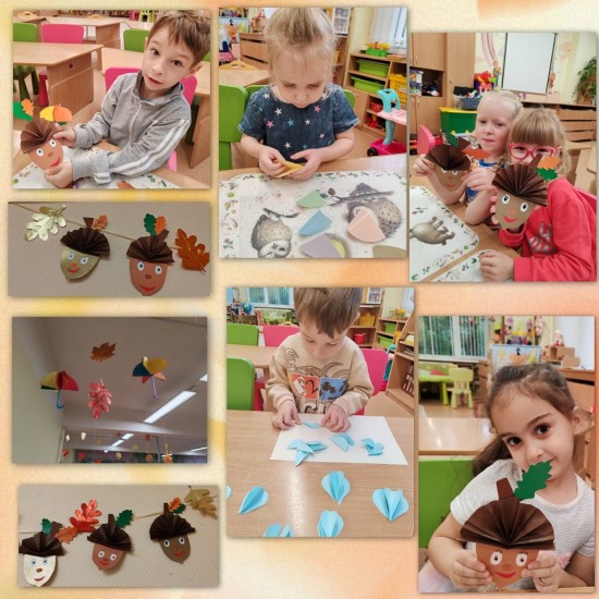 Вот и подходит к концу первый месяц осени. Всe больше и больше она вступает в свои права. Листья на деревьях меняют окраску, близится золотая осень... На творческой мастерской ребята сделали поделку «Весёлые жёлуди» и зонтики с капельками, которыми мы украсили помещение группы.