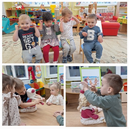 А еще в музыкальном зале на занятии ребята познакомились с музыкальными инструментами: маракасом и бубном. Поиграли и повеселились. Ежедневно мы проводим игры на развитие речи.