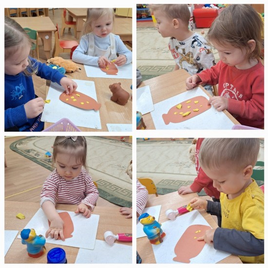 | Вот и наступил октябрь, а наши малыши времени зря не теряют, в нашей группе кипит настоящая, хоть и маленькая, жизнь! Наши непоседы успевают все: накормить петушка зернышками из пластилина, сделать конфетки для куклы Тани, украсить красками, рисуя пальчиками, мячики для наших кукол. А еще поиграть в разные развивающие игры. Потанцевать с осенними листочками.