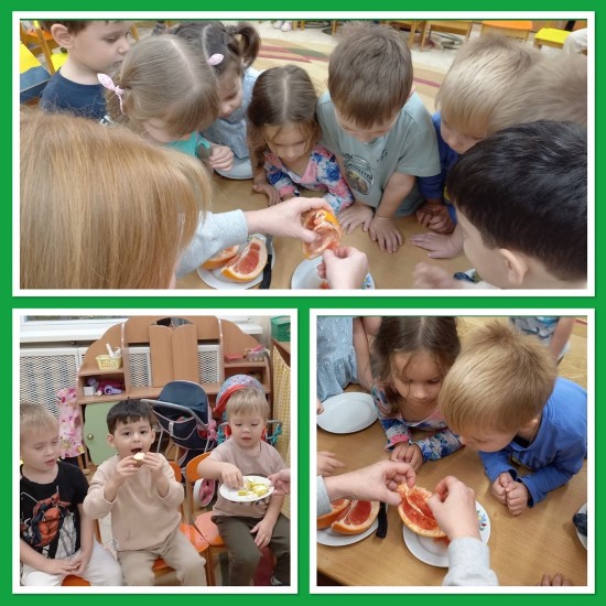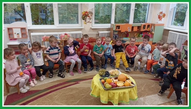 | Неделя с 6 по 10 октября была посвящена фруктам. Спасибо нашим дорогим родителям за оформление выставки. Наша корзинка наполнилась всевозможными настоящими фруктами. Снова новые иллюстрации, загадки про фрукты и чтение сказок. Самая наша любимая сказка «Мешок яблок». Очень уж понравилось ребятам, как одна яблонька всех зверушек накормила. В группе мы с ребятами играем в разные игры: речевые – «Назови ласково», «Скажи где растёт»; настольные – «Что где растёт», «Во саду ли, огороде»; собираем пазлы. Ребята уже знают несколько пальчиковых игр: «Капуста и морковка», «Сорока-Ворона», разучивают новую пальчиковую игру «Апельсин». Итогом пройденных тем стала игра «Узнай на вкус». Очень интересно получилось. Сперва ребята все фрукты рассмотрели, потрогали и понюхали. Любопытно было сравнивать апельсин и лимон, рассматривать гранат и персик, ведь мы все фрукты ещё и разрезали. Сравнили по цвету, размеру и запаху. Также мы рассматривали киви, сливы, грушу и нектарин. В общем, получилось здорово!