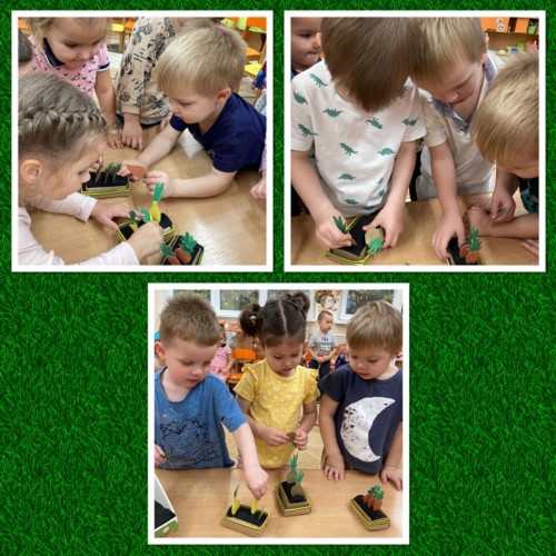 Ребята ходили на физкультуру, там вместе с инструктором Людмилой Юрьевной играли с обручами и собрали урожай морковок.