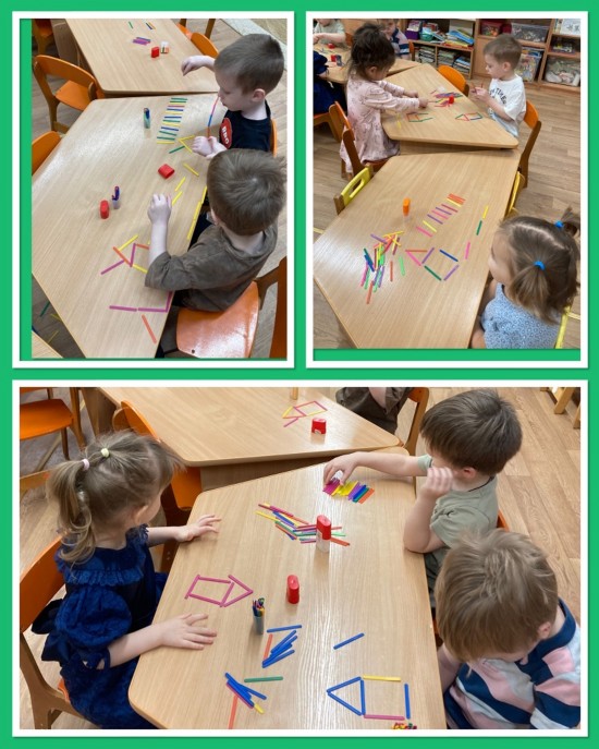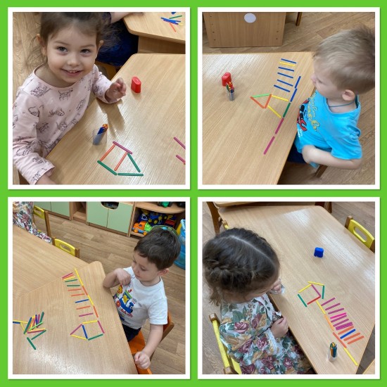 Большое внимание в группе мы уделяем развитию математических способностей ребят. Недавно мы начали знакомиться со счётными палочками. Сначала мы рассмотрели палочки, потом ребята показывали палочки определённого цвета, закрепляли цвета. Далее с большой заинтересованностью выполняли несложные задания по постройке знакомых фигур, выкладывали палочки по образцу воспитателя. Например, такие задания: «Построй дорожку», «Построй заборчик». С помощью воспитателя малыши строили домик, сперва сделали пол, потом стеночки, и сверху потолок. А потом сделали и крышу. Не сразу, но ребята справились с непростыми заданиями. Дома, уважаемые родители, вы также можете поиграть с детьми со счётными палочками, строить разные постройки.
