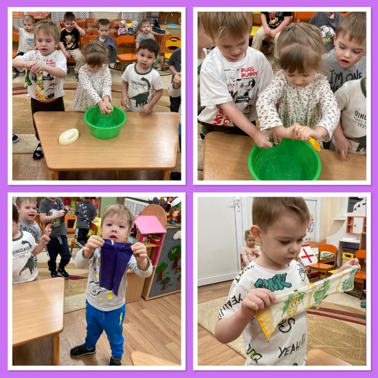 Провели образовательную ситуацию «Постираем куклам полотенца». Набрали в тазики водички, взяли мыло, замочили вещи и давай ручками стирать. А потом и полоскать, в чистой водичке. Ребятам понравилось помогать полоскать и отжимать вещи, хотя было тяжело.