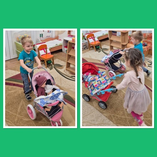 Ну, а в конце недели мы играли в «Дочки – матери» Мальчики стали папами, девочки мамами, а наши куклы – детками. Наши родители старались накормить деток перед прогулкой, готовили яичницы, грели сосиски в кастрюльке и наливали чай в чашечки. А потом нужно было одеть малышей потеплее, потому что зима и на улице холодно. Папы надевали малышам шапки, а мамы укрывали тёплым одеялом и все дружно ездили на прогулку.