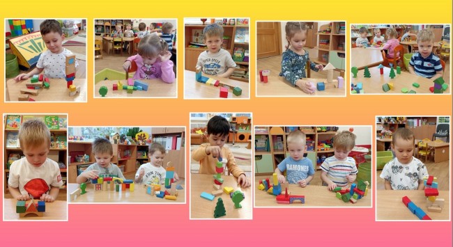Также ребята вспомнили понятия «большой-маленький». К нам приходили матрешки, мы с ребятами их рассмотрели, сравнили, а потом построили для них разные по величине домики.