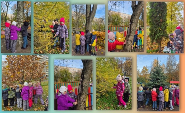 С 24 по 28 октября мы с детьми беседовали о деревьях и кустарниках, вспомнили их строение, чем отличаются, отгадывали загадки, рассматривали иллюстрации осенних пейзажей, рисовали осенний лес, играли в такие игры как: «С какого дерева листок?», «Чьи плоды?». На улице мы совершили прогулку вокруг детского сада, на которой рассматривали деревья, листья, трогали иголки, стволы. Ребята увидели, что все деревья отличаются и внешне и на ощупь, прогулка получилась очень интересной и познавательной.