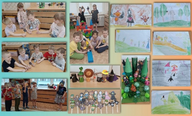 Неделя с 3 по 7 апреля была посвящена народному творчеству. Играя в художественные дидактические игры, ребята знакомились с русскими народными промыслами: хохлома, гжель, дымковская игрушка, городецкая роспись. А так же, мы продолжали готовиться к спектаклю. Делали афишу, сделали пригласительные билеты для групп «Солнышко» и «Светлячок», репетировали роли. Перед премьерой мы сделали в группе настольные театры и дети сами обыгрывали роли из сказки, также по нашей сказке создали альбом с иллюстрациями. Кроме этого дети учились шить и самостоятельно сшили персонажей пальчикового театра.