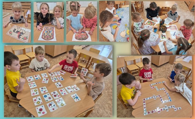 С 14 по 18 апреля мы в группе знакомились с народными росписями, дети узнали про Гжельскую, Хохломскую, Дымковскую, Филимоновскую и Городецкую росписи. Мы читали про них, изучали элементы росписи, знакомились с историей. Дети рассматривали предметы русских мастеров – игрушки, посуду и были очень поражены тем, с каким трудом всё это создавалось, и что люди трудились семьями и передавали все свои умения из поколения в поколение. В группе дети с помощью аппликации украсили матрёшек, расписывали Дымковские игрушки, лепили Филимоновские. Ребята собирали пазлы, играли в лото, украшали яркими узорами Дымковские игрушки, из кубиков собирали узоры, также мы играли в различные подвижные русские народные игры.  |