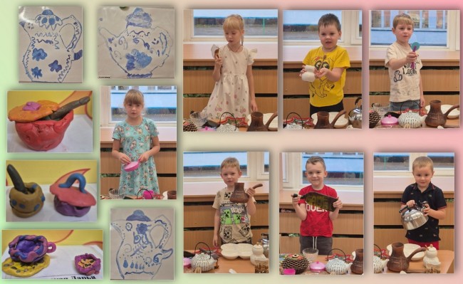 Последняя неделя февраля была посвящена теме «Посуда». Дети узнали, что посудой люди пользовались с древних времён, сначала она была деревянная и глиняная, потом появилась стеклянная, металлическая, фарфоровая и пластмассовая. Вместе с ребятами мы рассматривали разные виды посуды: кухонную, столовую, чайную, называли, из каких частей состоит посуда, составляли описательные рассказы, сортировали, играли в лото. На занятии ребята слепили посуду из пластилина. Мы благодарим всех, кто помог организовать в группе выставку посуды.