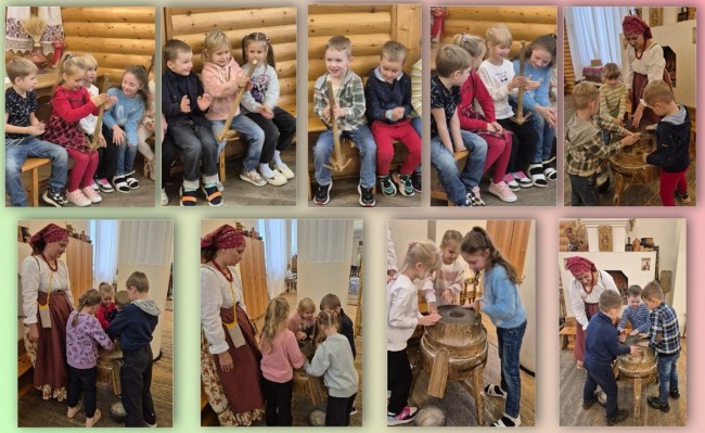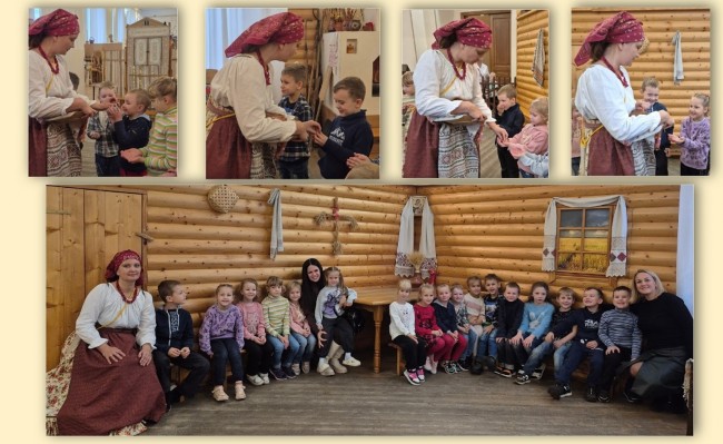 21 сентября мы с детьми нашей группы ездили на экскурсию в «Сказкин дом». На экскурсии мы знакомились с русскими традициями встречи осени. Ребята узнали, как наши предки предсказывали погоду, предвещали урожай, как судили о достатке. Детям рассказали о том, что все были заняты своей работой по дому, никто не «бил баклуши». Маленькие дети помогали убираться в доме, мальчики помогали мужчинам, девочки – убирали дом, шили, принимали участие в приготовлении пищи. Ребята отгадывали загадки про овощи и фрукты, узнали, какой долгий путь совершает хлеб, прежде чем попасть к нам на стол, угадывали с какого дерева листок, увидели серп, веретено, лапти, вышивки и самодельные куклы и игрушки. Экскурсия была очень интересной и познавательной.