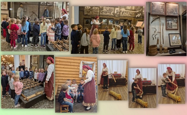 12 октября мы ездили всей группой в Этнографический музей на интерактивное занятие по теме «Плачет хлебушек, когда ест его лентяй» Дети узнали о традициях земледелия, об особом отношении русских людей к хлебу. Порадовало, что дети не только слушали, но и активно показывали свои знания, ведь в течение недели мы много говорили о хлебе, о том сколько людей задействовано в его производстве. В музее дети увидели большую борону, познакомились с мутовкой, потрогали серп и косу. Все ребята мололи муку на жерновах, мальчики поработали цепом и убедились, что выбивать зёрна из колосьев – это была очень нелёгкая работа. Дети испекли в русской печи ржаной хлеб, а потом полакомились им. Очень интересная и познавательная была экскурсия.
