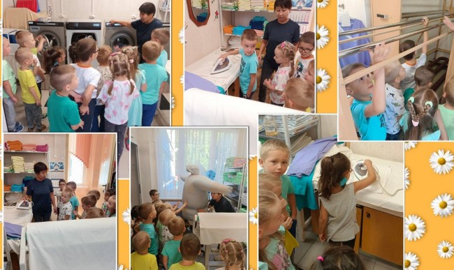 В начале сентября, когда наши новые ребята уже адаптировались, в нашем детском саду проходит неделя знакомств. Ребята ходят на экскурсии и знакомятся с работниками нашего учреждения. Мы побывали в прачечной, у Цирмы Батожоргаловны, где увидели большие стиральные машины, специальный валик для глажки белья и занавесок. Но самым интересным был гладильный манекен, который надувается с помощью потока теплого воздуха и без труда отглаживает рубашки и халаты.