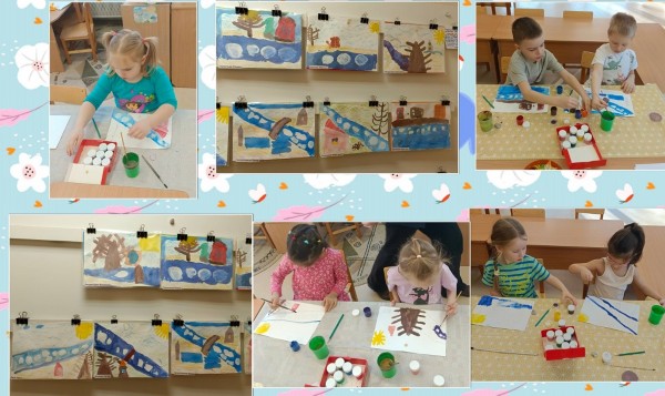 Мы познакомили ребят с весенними цветами мимозой, закрепили понятие первоцветы. Ребята рассмотрели веточки вербы, а потом отразили свои знания в лепке и аппликации. А в ходе рисования изображали ледоход на реке.