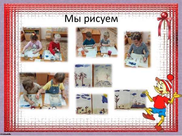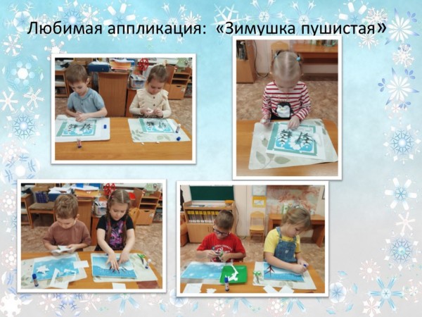 Знакомство с произведениями искусства происходило на примере репродукций картин В. И. Сурикова «Взятие снежного городка», А. А. Дейнеки «Хоккеисты»; иллюстраций в художественной литературе: р. н. с. «Рукавичка», Е. Янковская «Я хожу в детский сад», Н. Носов «На горке», книги для совместного рассматривания с детьми «Что мы делали зимой» и др., энциклопедий, открыток, фото.