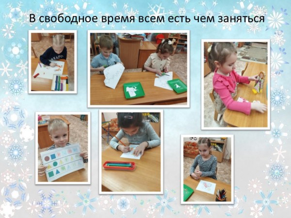 За неделю у всех в группе было много важных дел: дети многое узнали и повторили, во многие игры поиграли: дидактические игры «Зимние слова», «Назови одним словом», «Подбери признак», «Закончи предложение», «Объясни, почему…», «Что изменилось?», «Геометрическое лото», «Найди отличия», «Составь картинку», «Собери пейзаж», «Собери снежинку», пазлы, Лего, игры – ассоциации, «Палочки Кюизинера» и подвижные игры: «Мороз – Красный нос», «Снег – метель - вьюга».
