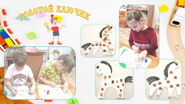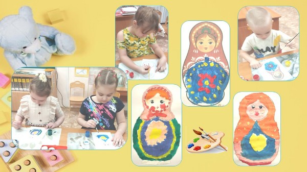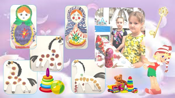 На лепке слепили любимую игрушку, на аппликации украшали лошадку (по мотивам народной росписи). Для этого вырезали круги, используя метод сложенной бумаги в несколько раз «гармошкой». А какие замечательные матрёшки получились у каждого из ребят на занятии по рисованию!
