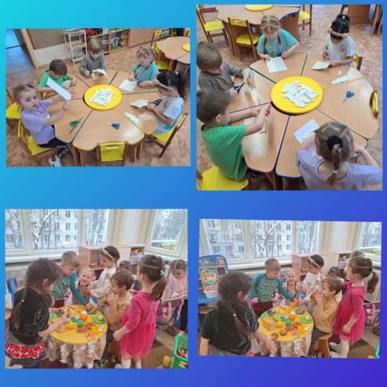Для развития речи ребят мы играли в речевые игры «Назови ласково», «Один-много», «Скажи наоборот». С большим удовольствием ребята прослушали музыкальные произведения «Бабушка рядышком с дедушкой», «Колючая семейка». Очень интересно было играть ребятам в сюжетно-ролевую игру «Семья». Однажды зазвонил телефон, позвонила бабушка, которая живёт в деревне и пригласила нас с ребятами в гости. Мы, конечно, согласились приехать. Стали думать: на чём же доехать до деревни, ведь нас много, также решили, что в гости с «пустым руками» не едут, что же делать? И решили ребята, что надо идти в магазин, чтобы было с чем чай попить. Так у нас открылся «кондитерский» отдел. Название для ребят новое, но в продаже у нас появились: вафли, пирожные, пончики и конфеты. Некоторые ребята смогли в этот раз побывать в роли покупателя или продавца, повторить несложные диалоги, слова приветствия. Ну, а до деревни решили ехать на автобусе. Выбрали водителя, оказалось совсем не просто объявлять громким голосом остановки и сообщать об открытии и закрытии дверей, зато интересно. А на кухне у бабушки уже был накрыт стол. Ребята обратили внимание на скатерть на столе, салфетки, чайный сервиз и столовые приборы, а особенно на конфетницу с конфетами. Дети подарили бабушке свои угощения, помогали разливать чай в чашечки и угощались принесёнными фруктами и сладостями. В общем, чаепитие удалась и все были довольны. Уважаемые родители. Сюжетно-ролевые игры являются важным компонентом развития коммуникативных навыков, социальных отношений. Поэтому так важно для детей пятого года жизни проигрывать разные сюжеты из повседневной жизни: как ведут себя продавцы, что говорят. Или, как вести себя, когда пригласили в гости, что делать в гостях, как принимать гостей. Как ведёт себя водитель, а как пассажиры, что при этом говорят. В играх детям важно научиться договариваться, проигрывать ролевые взаимодействия в знакомых, повседневных сюжетах. Призываем вас дома обязательно играть с детьми в сюжетные игры.