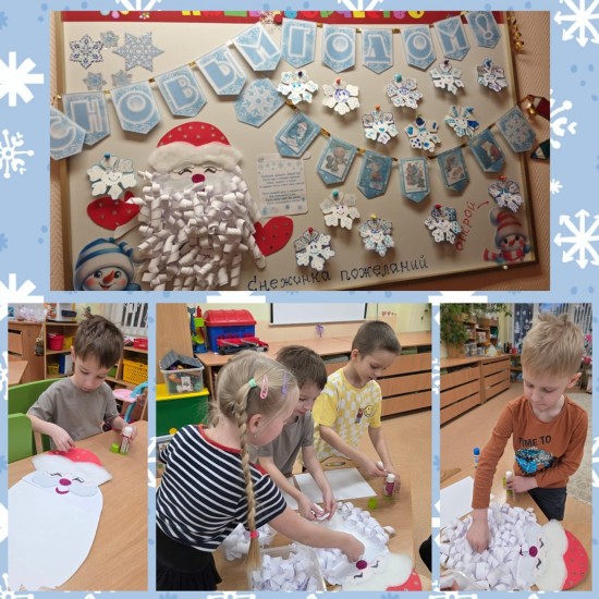 Мы вместе с детьми оформили пожелания родителям в форме снежинок. Каждый из ребят украсил свою снежинку и написал короткое пожелание. Из картона, бумаги и фоамирана смастерили Дедушку Мороза. Так появилась «Новогодняя снежинка пожеланий».