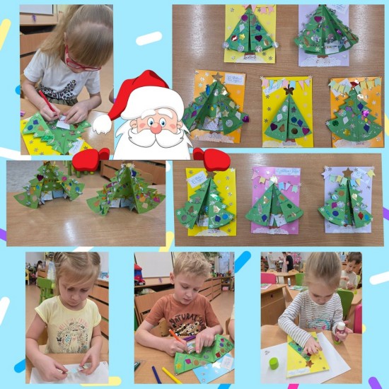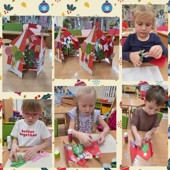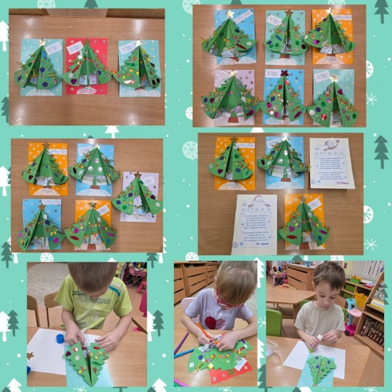 В преддверии новогоднего праздника на творческой мастерской мы с ребятами изготовили поздравительную открытку. Дети с радостью раскрашивали ёлку и оформляли подарки, в технике пластилинография создавали яркие игрушки и флажки из бумаги. Нашу поздравительную открытку мы разместили на выставке перед музыкальным залом.
