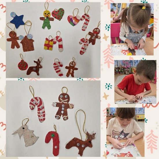 В Мастерской Деда Мороза царит атмосфера творчества и волшебства. На этой неделе дети создавали новогодние игрушки в технике пластилинография: ёлочные шарики, новогодние леденцы, пряничных человечков и т.п., которыми затем украсили свои ёлочки-дома.