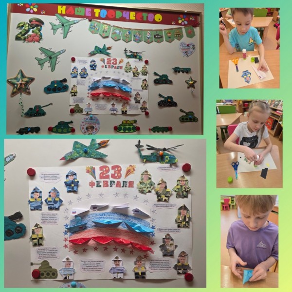 Неделя с 16 по 20 февраля была посвящена защитникам Отечества. С детьми мы продолжили знакомство с разными видами и родами войск нашей армии. В играх мы с ребятами закрепили: военные профессии; где кто служит; что нужно для работы военным разных войск; головные уборы и форму военнослужащих. Вместе с детьми мы оформили стенгазету про пехотинцев. Ребята рисовали обмундирование, а также, что пригодится пехотинцам, и как они передвигаются. На творческой мастерской создавали в технике оригами самолёты, корабли, военнослужащих нашей армии, военную технику в технике пластилинография и оформили поздравительную газету.