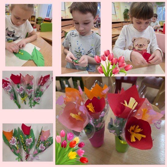 В преддверии 8 марта мы с ребятами закрепили знания о женских профессиях в детскому саду и изготовили красивые тюльпаны с мимозами в подарок сотрудникам детского сада. С праздником весны и красоты! Счастья и улыбок!