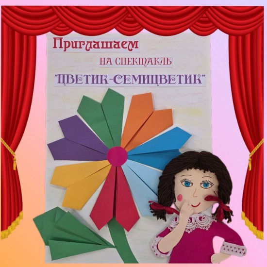 В рамках проекта по театрализованной деятельности мы познакомили детей и с театральными профессиями. Обратили внимание, что актёр - волшебник театра. Скоро дети примерят и на себе эту роль... Для постановки мы выбрали сказку Валентина Катаева «Цветик-семицветик». Прочитали еe, рассмотрели иллюстрации, посмотрели мультфильм; порассуждали о желаниях девочки Жени; чему эта сказка учит. На творческих мастерских мы с ребятами изготовили афишу и пригласительные билеты на спектакль; нарисовали героев нашей постановки, прикрепив их затем на прищепки. Так, в нашем театральном уголке появился ещё один вид театра. Из пластилина дети вылепили своих любимых героев сказки. Ребята разыгрывают сценки, пробуют себя в разных ролях; с удовольствием играют в театр, используют разные атрибуты и готовятся к премьере спектакля.
