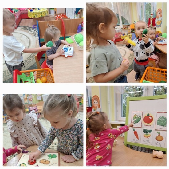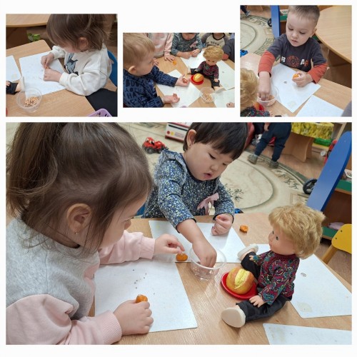 Две недели с 6 по 17 октября у нас были очень насыщенные. Мы с ребятами рассматривали иллюстрации с изображением овощей и фруктов. Узнали, что яблоки, груши, апельсины - это фрукты, и они растут на деревьях. Капуста, морковь, репка, помидор,картошка, все это можно назвать одним словом «овощи», и они растут на грядке. Еще узнали, что фрукты и овощи можно купить в магазине. Познакомили ребят с кисточкой, показали, как правильно держать кисточку во время рисования, набирать краску и промывать кисточку в водичке. Лепили угощение для куклы - яблочки. Вспомнили сказку «Репка». Ходили на физкультуру, играли с орешками и собрали урожай моркови. Выучили пальчиковую игру про капусту и яблочко: Круглое, румяное Растет оно на ветках, Любят его взрослые И маленькие детки. И про капусту: Мы капусту рубим, рубим. Мы морковку трем, трем. Мы капусту солим, солим. Мы капусту жмем, жмем. Ежедневно мы проводим игры на развитие речевого дыхания. Уважаемые родители, рекомендуем вам повторить названия овощей и фруктов, а также новые пальчиковые игры.