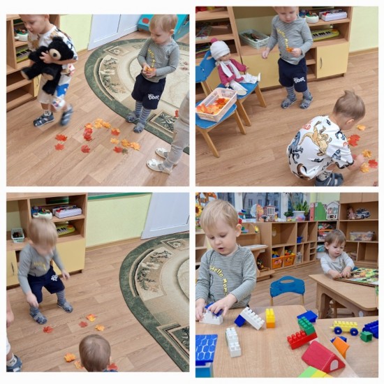 Вот и наступила золотая осень. С 20 октября по 31 октября мы с малышами говорили об осени, ее основных приметах и признаках. Малыши узнали, что осенью листочки желтеют, засыхают и падают на землю. Солнышко греет уже не так сильно, на улице становится холоднее и люди теплее стали одеваться. Часто идут дожди. Малыши, используя краски, пальчиками украшали зонтики для кукол и еще дружно собирали осенние листочки. У нас прошёл музыкальный досуг, наши музыкальные руководители рассказали малышам осеннюю сказку, а потом мы пели песенку, танцевали с осенними листочками и играли в игру «Солнышко и дождик». Рассматривали иллюстрации с птицами: петуха, курицы, воробья, синицы, вороны. Малыши узнали, что у птиц есть крылья, клюв, лапки. И, конечно, мы играли в подвижные игры: летали, как птички, а потом прятались от кошки. В гости прилетала синичка и малыши перебрали горошек и покормили синичку. А ещё жёлтым пластилином наши маленькие художники украсили грудку синичкам. Мы учим малышей играть вместе, делиться игрушками, строить разные постройки из кубиков. Уважаемые родители, во время прогулок рассказывайте ребенку об осени, используя форму диалога. Даже если, малыш не говорящий, делайте паузы и задавайте вопросы (а выждав немного времени, сами на них отвечайте). Поздравляем вас с наступающим Днём народного единства!