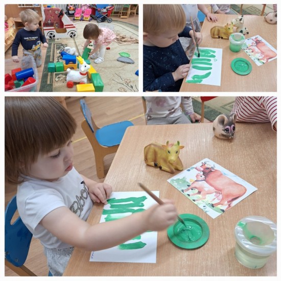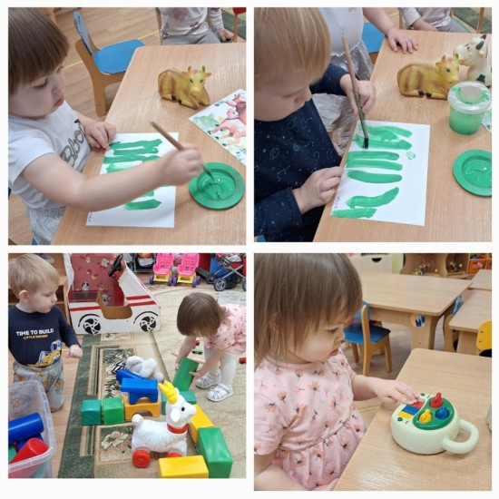| С 1 ноября по 14 ноября мы с малышами говорили о мире животных. Мы формировали у детей представления о диких и домашних животных Рассказали об их внешних признаках, о том, как «кричат» и что едят. К нам в гости приходила коровка и ребята для рисовали травку, чтобы ее угостить. Для барашка строили домик. А для щенка слепили мячики, чтобы ему было веселей.