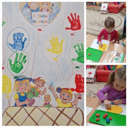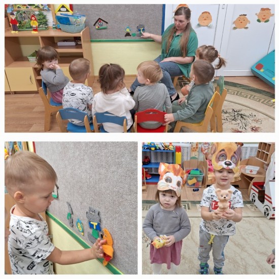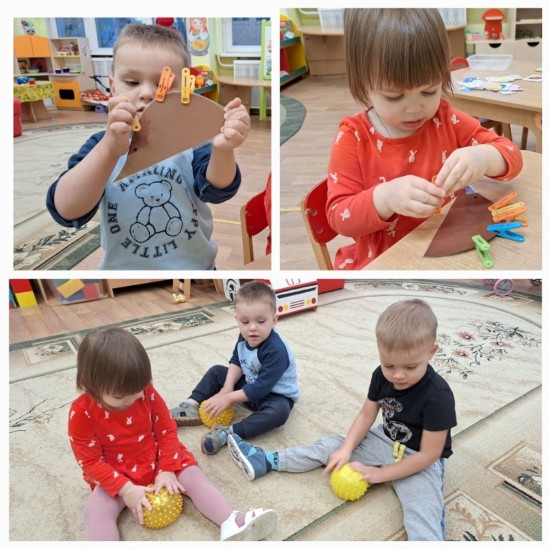 Малышам мы показали сказку на панно «Колобок». Проговорили о поведении на улице, что всегда нужно слушаться родителей и не убегать от них. Ежедневно мы проводим игры на развитие мелкой моторики: делали ежику колючки из прищепок, ладошками раскатывали массажные мячики. Малышам очень нравятся такие игры, а главное они способствуют активному развитию речи. А ещё мы совместно с родителями поучаствовали в акции помощи бездомным животным, родители передали разные подарки для приюта, а мы с малышами нарисовали плакат. Успели выучить новую пальчиковую игру: