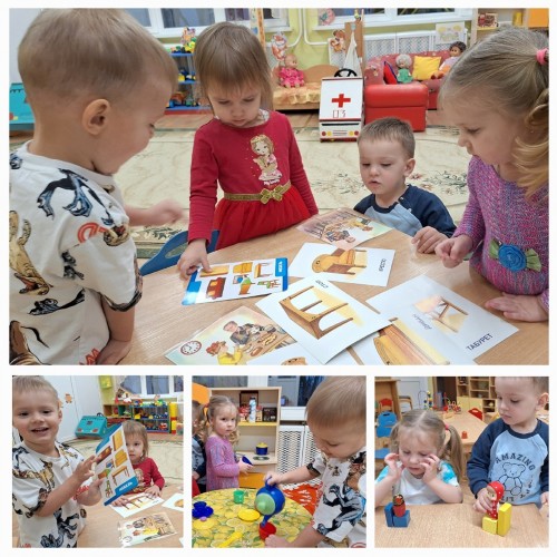 А еще в музыкальном зале на занятии ребята познакомились с музыкальными инструментами: маракасом и бубном. Поиграли и повеселились. Ежедневно мы проводим игры на развитие речи.