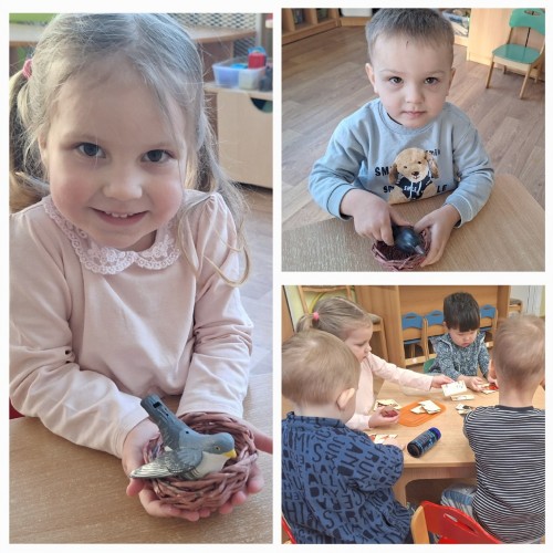 Ещё мы говорили о птицах, их жизни зимой. Рассматривали иллюстрации с птицами, узнавали название частей тела: голова, крылья, хвост, клюв. Прочитали стихи М.Бирюкова «Птички». Учили ребят различать птиц по внешнему признаку.(снегирь, воробей,синица).