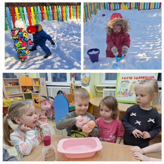 Вот и пролетели новогодние каникулы. Малыши пришли отдохнувшие и повзрослевшие. Дни с 12 января по 16 января пролетели очень весело и интересно. Мы с ребятами вспомнили о признаках зимы. Представили, что мы помощники Дедушки Мороза и нарисовали узор на окне. Устроили снегопад с помощью шариков из пластилина. Говорили о зимних забавах. Читали стихотворения: «Съезжают санки сами вниз...» (О. Островский), «Мы хотим зимой играть» (А.Мальцева). Еще вспомнили о разных животных, заодно закрепив понятия «большой-маленький». Играли в подвижную игру «Самолеты». Продолжаем развивать у детей нравственные чувства, прежде всего любовь к семье: к папе, маме, бабушке и дедушке; понимание, чем они занимаются, какие у них есть домашние заботы, и о том, что нужно помогать им. В первую очередь, убирать свои игрушки в комнате. Еще мы с ребятами кормили и укладывали кукол спать, гладили белье, поливали цветы. Но забавы забавами, а про культурно-гигиенические навыки мы не забываем. После прогулки и перед едой не забываем мыть руки и насухо вытирать полотенцем. Все ребята знают свои полотенца, находя их по картинке. Повторили пальчиковую игру с элементами самомассажа «Неболейка»: Чтобы горло не болело.