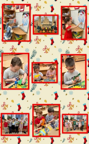 В нашей группе продолжает работать мастерская Деда Мороза. Мы с ребятами изготовили красивые поздравительные открытки и газету. Ребята нарисовали большую ель и украсили её яркими игрушками с наилучшими пожеланиями для своих родных и близких.