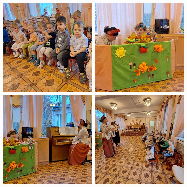 А еще наши музыкальные руководители пригласили нас на осеннюю сказку и наши ребята, как настоящие зрители, внимательно смотрели представление и хлопали в ладоши.
