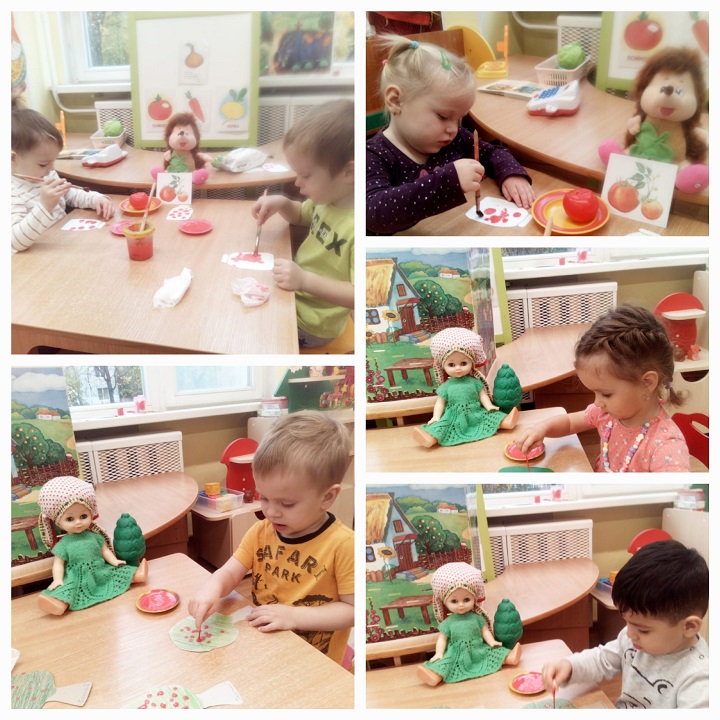 «Познакомили» ребят с кисточкой, показали, как правильно держать кисточку во время рисования, набирать краску и промывать кисточку в стаканчике с водой. Лепили угощение для куклы - яблочки. Вспомнили сказку «Репка».