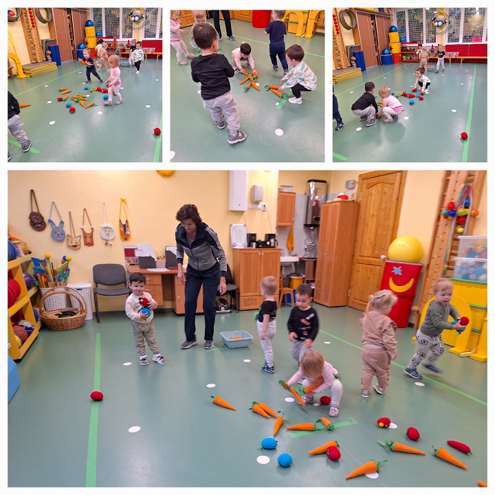 Ребята ходили на физкультуру, там вместе с инструктором Людмилой Юрьевной играли с обручами и собрали урожай морковок.