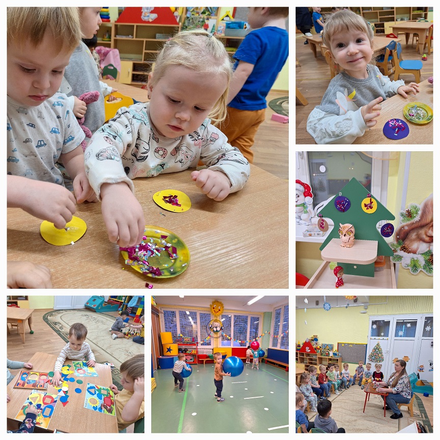 Также мы рассказали ребятам, как лесные жители готовятся к зиме. К нам в? гости приходила белочка, и мы для нее лепили подарки. Сделали коллективную работу «Елочка красавица», рисовали пальчиками огоньки. Мы стараемся проводить как можно больше игр на развитие речи, вот, например, наши малыши любят играть с мячом, передавая мяч друг другу стараются назвать имя того, кому передаёт мяч. Вспомнили сказку «Колобок» , рассказывая ее, мы обратили внимание на то, что нельзя разговаривать с чужими людьми на улице и убегать от родителей. А самое главное, у нас прошел первый новогодний праздник. Малышей встречала елочка красавица. Мы дружно хлопали и топали, чтобы зажглись на елочке огоньки. К нам приходили на праздник белочка и мишка, Снегурочка и Дед Мороз. Ребята танцевали, пели песни для них и, конечно же, получили долгожданные подарки. Праздник прошел весело и интересно. А еще мы? стараемся укреплять свой организм. Много гуляем, играем на улице и по утрам делаем зарядку. Уважаемые родители, поздравляем вас с наступающим Новым Годом! Главное, здоровья, мира и душевного спокойствия!
