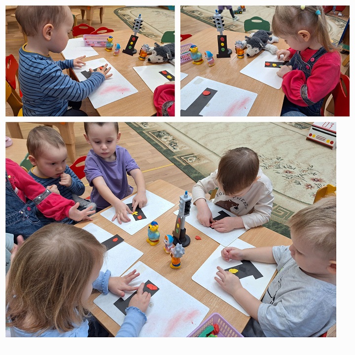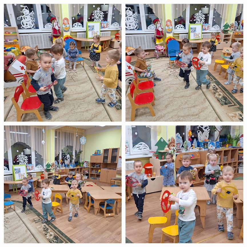 По шоссе идут машины (крутим воображаемый руль) По асфальту едут шины (ладони двигаются параллельно друг другу) По дороге не беги (погрозить пальцем) Я скажу тебе : «Би-би» (рука сжата в кулак, большой палец выпрямлен) Еще мы играли в дидактические и подвижные игры. И еще мы готовили нашей кукле обед, но сначала ребята садились в автобус и шофер их дружно вез в магазин за продуктами. А еще наши ребята любят лепить и рисовать. Рисовали дорогу для машины, лепили сигналы светофора для игры с машинами, а еще лепили самолётики. Уважаемые родители, понаблюдайте на улице за движением различного транспорта, побеседуйте с ребенком о том, на какой свет светофора можно переходить улицу и на какой нельзя, проиграйте с детьми в наши новые пальчиковые игры «Молоточком я стучу» и «Транспорт». Дорогих наших дедушек и пап поздравляем с Днём защитника Отечества!
