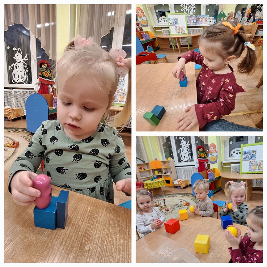 Также ребята вспомнили понятия «большой-маленький». К нам приходили матрешки, мы с ребятами их рассмотрели, сравнили, а потом построили для них разные по величине домики.