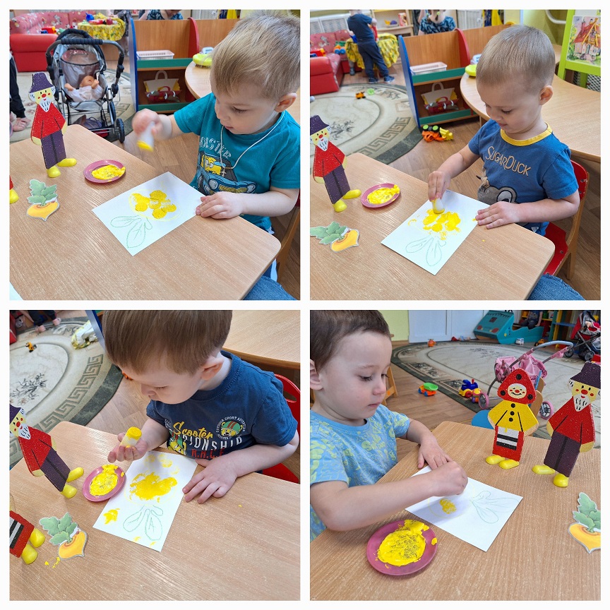 Ещё в гостях у нас побывали дедушка с бабушкой .Малыши для них нарисовали репку и слепили колобков...Мы наших малышей продолжаем учить закрашивать рисунок, не заходя за контур.