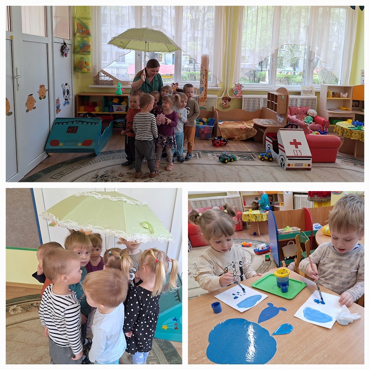 Первые недели октября прошли интересно и насыщенно. Мы с малышами говорили об осени, ее основных приметах и признаках. Малыши узнали, что осенью листочки желтеют, засыхают и падают на землю. Солнышко греет уже не так сильно, на улице становится холоднее и люди теплее стали одеваться. Часто идут дожди. Мы с малышами пальчиками, используя краски, украшали зонтики для кукол. А еще в гости к нам приходил ёжик, и мы для гостя лепили из пластилина осенние листочки.