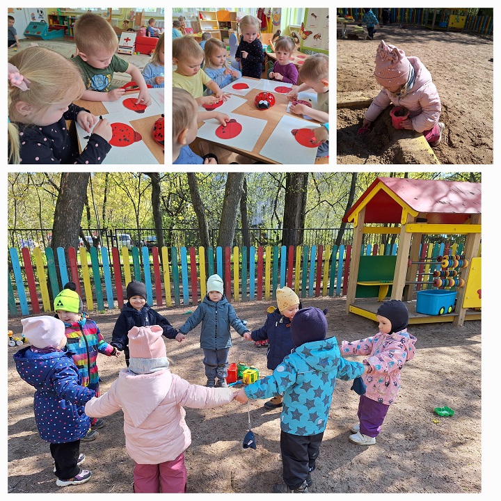 С 12 по 16 мая к нам в группу «прилетали» бабочки и божьи коровки, наши малыши познакомились с насекомыми, мы рассмотрели их внешний вид, учились находить их на картинках и называть их. Выделять основные признаки (кто летает, кто ползает, кто кусается). Украшали бабочкам крылышки. Божьей коровке прилепили черные пятнышки, выучили потешку «Божья коровка». Проводили с детьми игры на развитие речевого дыхания, малыши дули на бабочку и она улетала с цветка. Узнали, что муравьи разговаривают между собой усиками, а пчелки передают информацию в танце. Выучили пальчиковую игру «Пчела»: Я пчела лечу, лечу меда свежего хочу Я лечу, я жу-жу я на клевере сижу. И конечно, в наших малышах мы воспитываем бережное отношение ко всему живому. Хотя погода постоянно менялась, мы с малышами много гуляли. Малыши на улице любят строить домики из песка, играть с мячом, знают уже много подвижных игр. В игре мы учим детей взаимодействовать со сверстниками, воспитываем бережное отношение к друг другу. Развиваем речь и обогащаем словарь детей. Ежедневно учим новые пальчиковые игры и повторяем уже знакомые. Уважаемые родители, закрепите с детьми знания о насекомых, рассмотрите иллюстрации с ними, прочитайте потешки и стихи: М.Бородицкая «Разговор с пчелой», А. Барто «Фонарик», Г.Сапгир «Пчелка». Обсудите с детьми после чтения эти стихи. Где летает пчёлка? Что приносит она домой? Как называется домик пчелы?