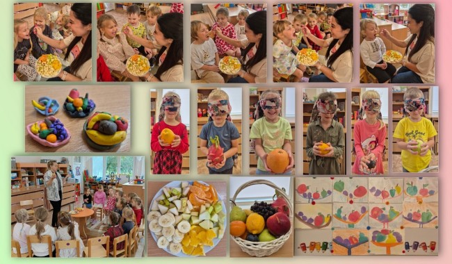 | Последняя неделя сентября была посвящена фруктам. Мы с детьми в группе составляли описательные рассказы о фруктах, играли в такие игры как: «Угадай на ощупь», «Что изменилось?», «Угадай на вкус», «Какое получится варенье/компот?», «Один - много». Дети лепили корзины с фруктами, делали их в аппликации, рисовали вазы с фруктами. Ребята закрепили знания об отличиях овощей от фруктов, познакомились с разнообразием фруктов (многие дети не могли назвать на начало недели никаких фруктов, кроме яблока, груши, банана и апельсина). Спасибо огромное родителям наших воспитанников за принесённые фрукты, благодаря вам у нас был хороший наглядный материал в течение недели и шикарная фруктовая корзина!